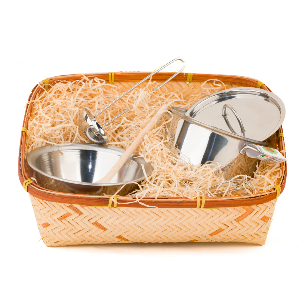 Set de cocina con utensilios de metal y madera. Bonito regalo de complemento del juego simbólico que viene presentado en una cómoda cesta.