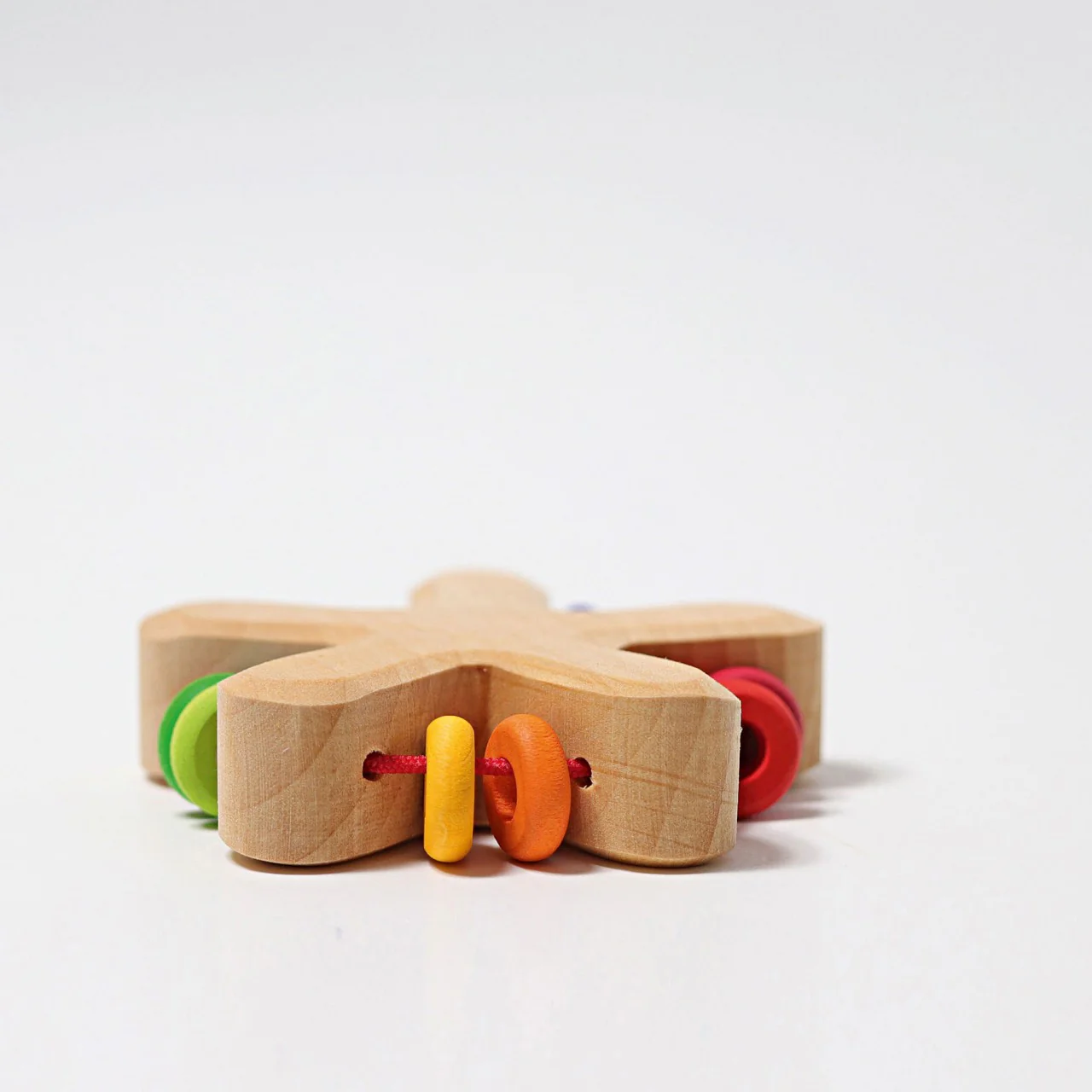 Bonito y delicado sonajero de madera en forma estrella con 10 discos con los colores del arcoiris. Como todos los productos de Grimms este sonajero está tratado con aceites naturales. Además sus suaves formas redondeadas lo hacen ideal para los más pequeños.