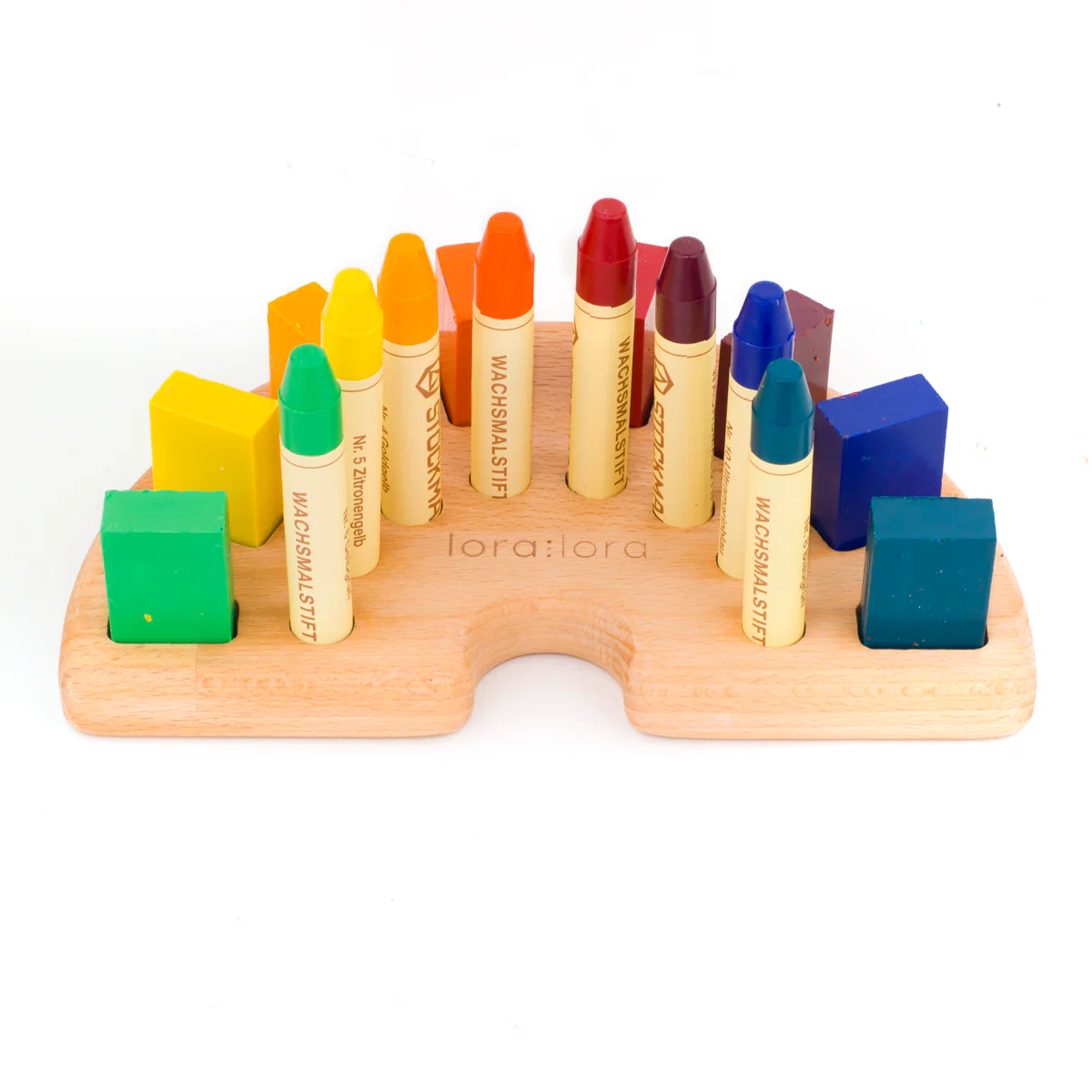 Práctico y bello soporte de madera de haya para lápices y bloques de cera. Permite clasificar y ordenar las ceras mientras los pequeños artistas dibujan y después quede todo decorativamente ordenado.