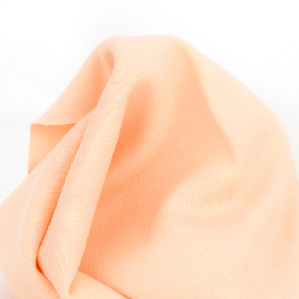 Tela de punto de algodón tono melocotón suave. Es un tono clarito con dominante rosácea para utilizarla como piel de las muñecas Waldorf.