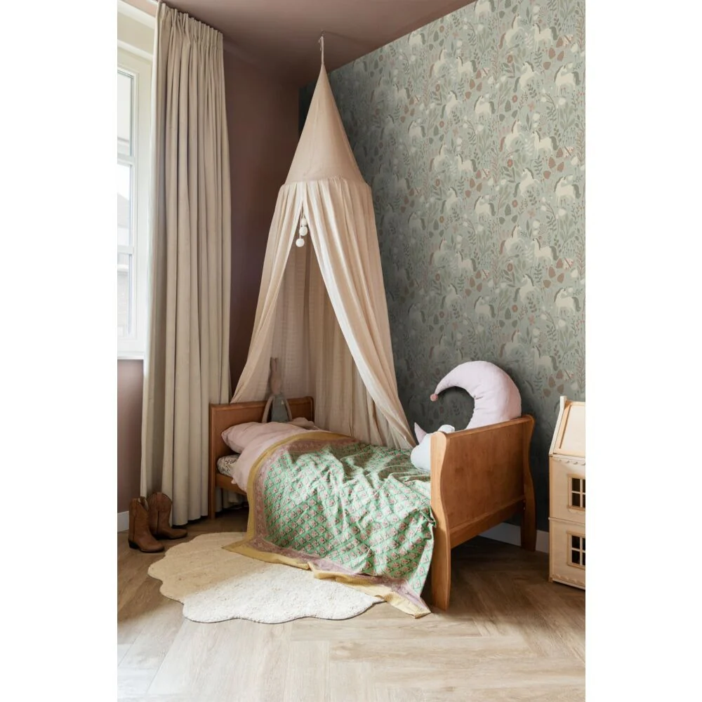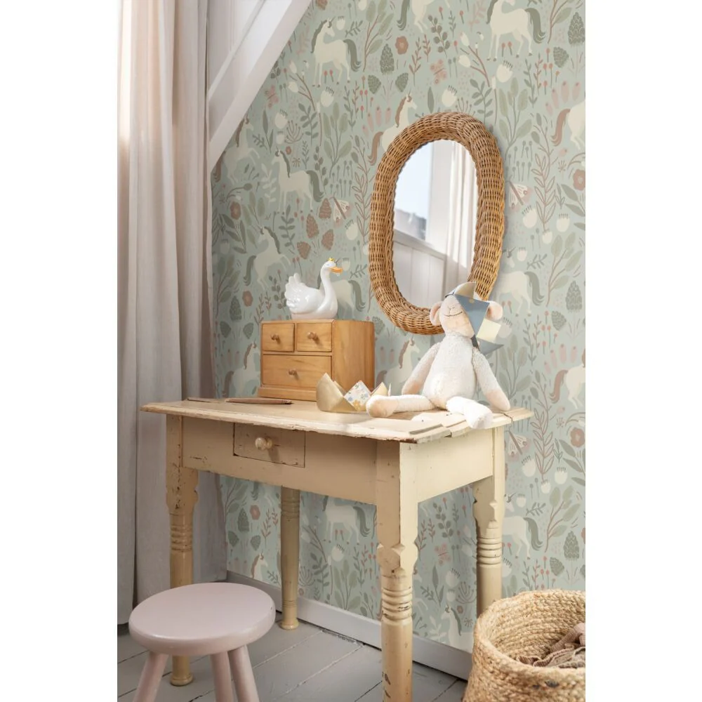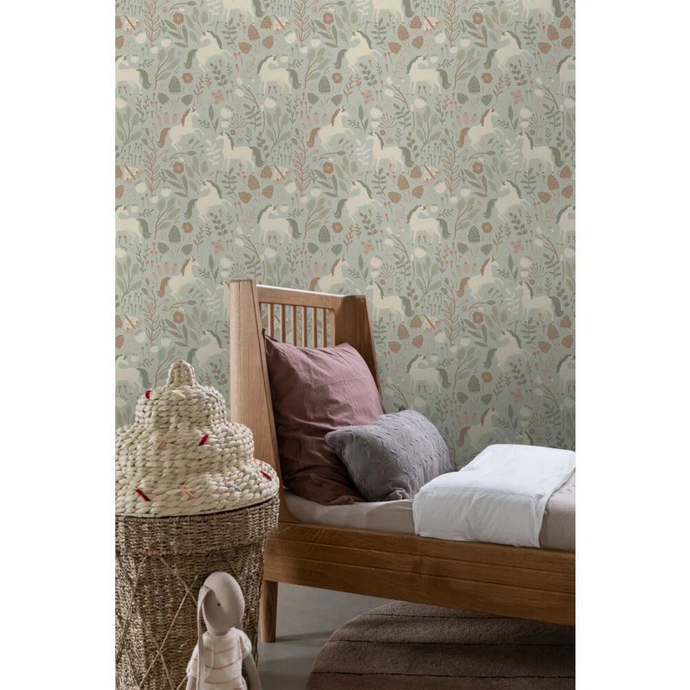 ¿Alguna vez has visto algo más adorable? Este bonito papel pintado con unicornios en verde grisáceo claro da un ambiente cálido, alegre y animado a la habitación de sus hijos. Deja que tu imaginación y la de tu pequeño corran libres y cree una habitación fantástica para niños para soñar y jugar.