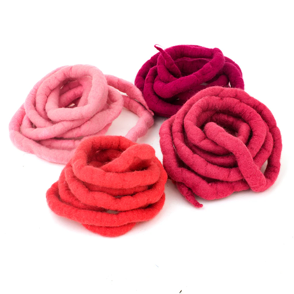 Resistentes cuerdas de juego realizadas artesanalmente con 100% lana de oveja merina teñida de diferentes colores. Se incluyen 4 cuerdas de 2 metros de longitud cada una en packs de diferentes tonos de rosas.